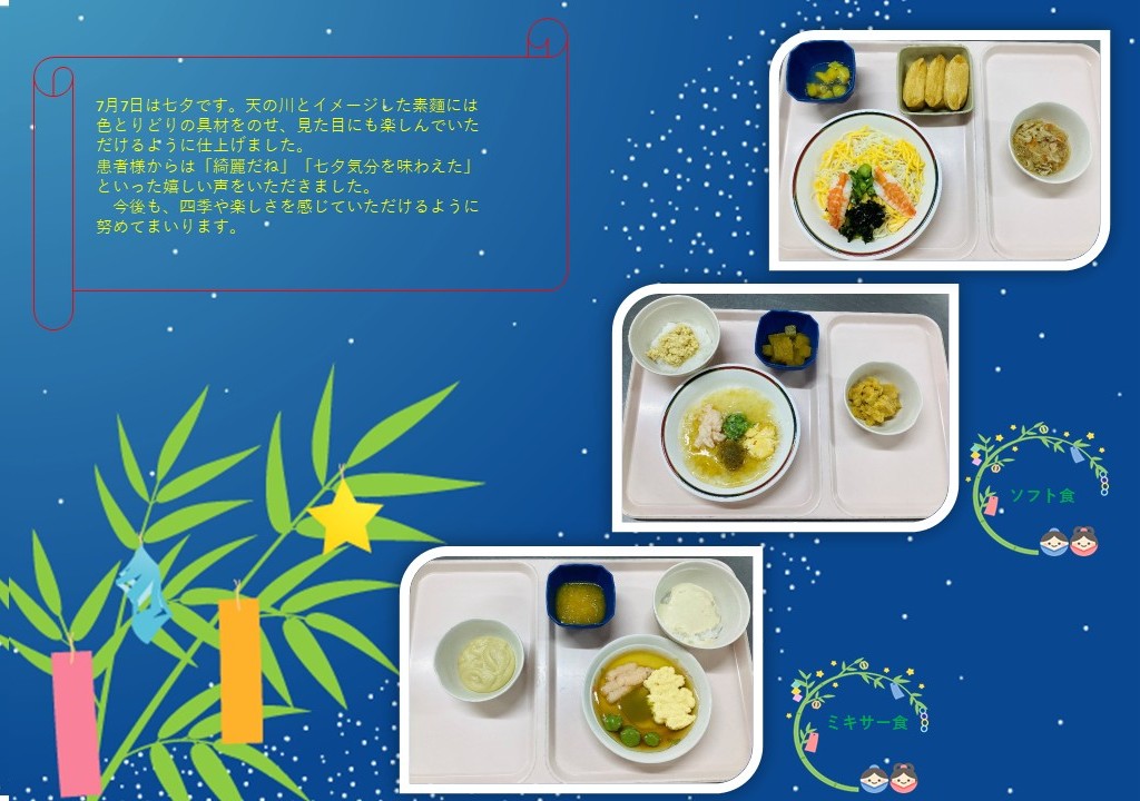 7日7日は七夕です。天の川をイメージした素麺には色とりどりの具材をのせ、見た目にも楽しんで頂けるように仕上げました。