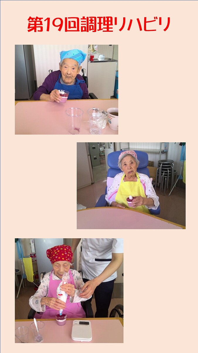 今回はフルーチェにヨーグルト、クラッシュゼリーに生クリームとボリュームたっぷりの豪華なおやつが完成しました。スプーンですくう場所によって味が変わり、「美味しいね。いっぱいあるね。」と喜んで食べられる姿にスタッフも嬉しくなりました。
