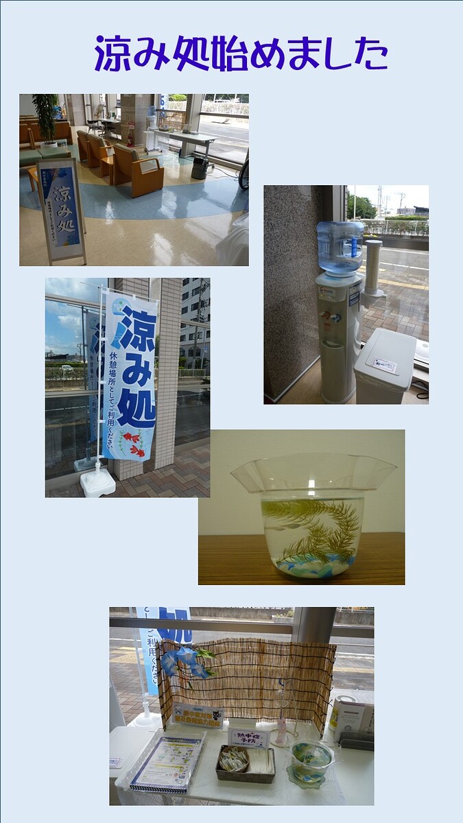 涼み処始めました。酷暑が続いていますが、ちょっと一休みしていきませんか?場所はJR南小倉駅降りて1分。駅の目前です。涼しげな青いのぼりを目印にどなたででもお気軽にお越しください。ミネラルウォーターと塩タブレットを準備して皆様のお越しをお待ちしています。