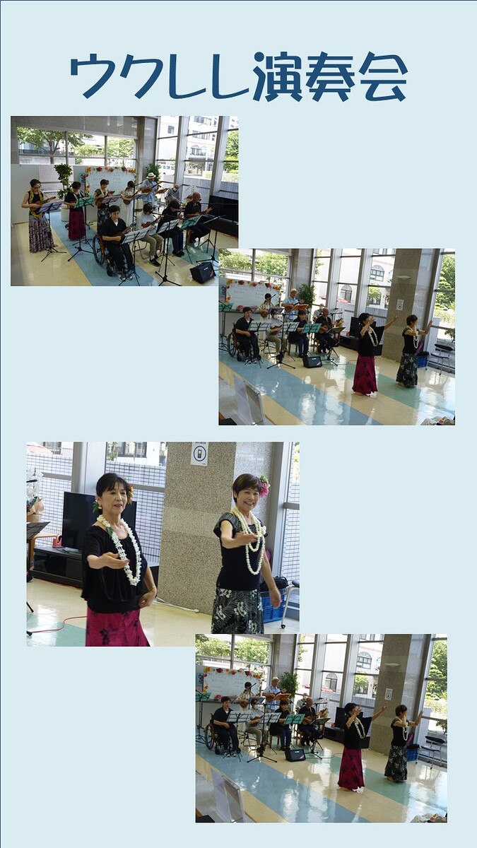 令和7年8月25日の14時より当院1階のロビーにおいてボランティアの方をお招きしてウクレレの演奏会を実施しました。久しぶりの演奏会ということもあり、大変盛り上がりました。