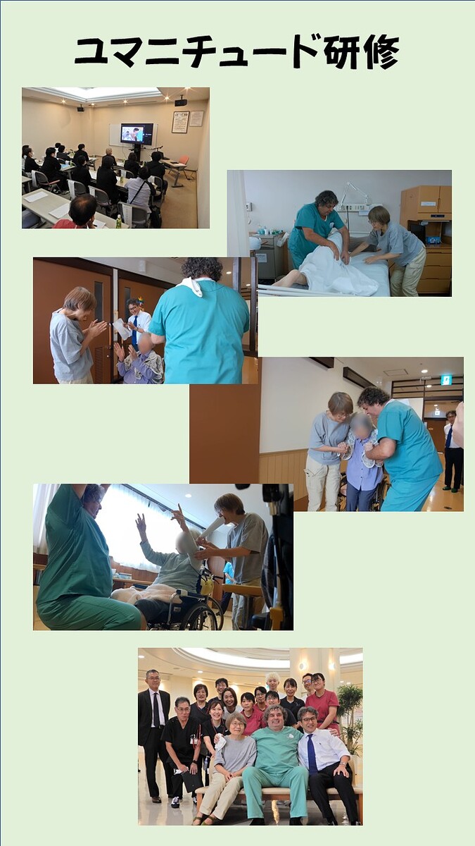2025年10月21日 当院において北九州市内の介護施設の職員にも参加していただき、包括的ケア技法である「ユマニチュード」の研修を開催しました。当日はユマニチュードの開発者であるイヴ・ジネスト先生と日本ユマニチュード学会 代表理事の本田美和子先生を講師としてお招きし、実際の患者さんに対して臨床での研修を行いました。「ユマニチュード」は福岡市が普及に力を入れていますが、当院も積極的に学んで、北九州での普及にもお役に立ちたいと考えています。